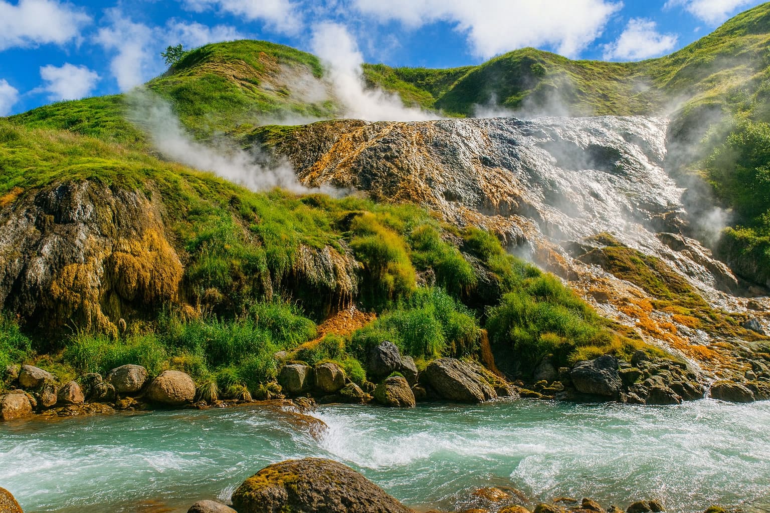 Камчатка — один из самых удивительных уголков России, где мощная вулканическая деятельность формирует неповторимый облик природы, определяет богатство её ресурсов. Здесь встречаются действующие вулканы, гейзеры, горячие реки, многочисленные минеральные источники. Эти воды — естественный результат подземной активности. Именно поэтому полуостров называют «страной огнедышащих гор». Минеральные и термальные источники встречаются почти повсеместно, за исключением Западно-Камчатской низменности и самых северных территорий.