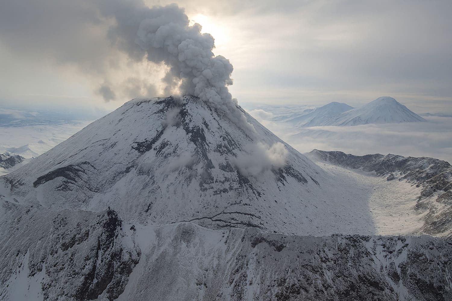 Вулкан Безымянный расположен в самом центре Ключевской группы вулканов на Камчатке, всего в 12 километрах от Ключевской Сопки. Его кратер впечатляет размерами: 2,8 × 1,3 км при глубине около километра — словно гигантская зияющая рана на поверхности Земли. Особенность вулкана — экструзивный купол на вершине, сформировавшийся в результате катастрофического извержения 1956 года. Помимо него, на склонах расположено 16 малых куполов — своеобразные отметки непрерывной вулканической активности. Именно эта уникальность делает Безымянный одним из самых изучаемых вулканов планеты.