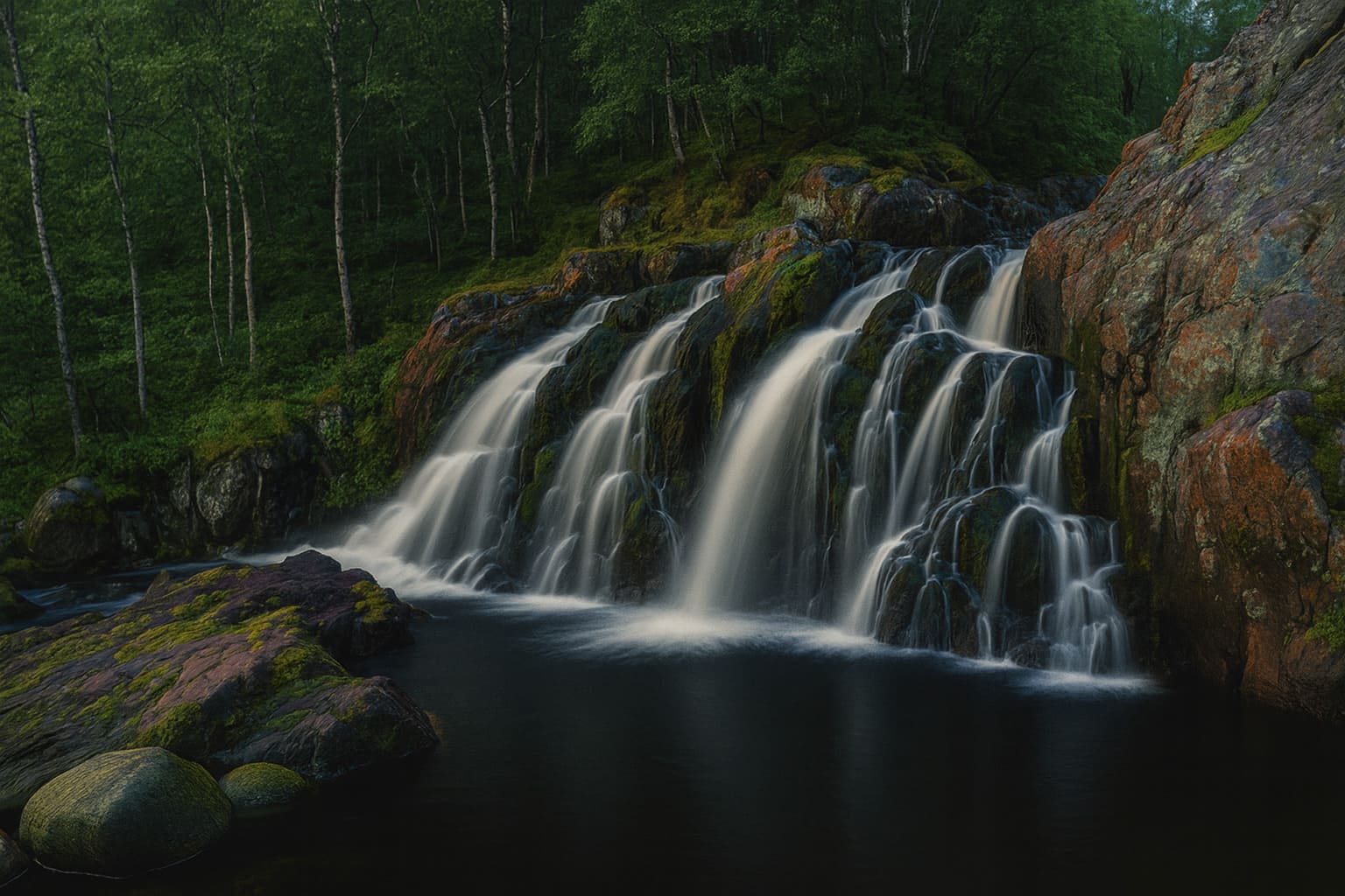 Вода с грохотом низвергается по каменным ступеням, образуя белоснежную пену. Скалы, мхи и лишайники вокруг создают суровый северный пейзаж, который особенно впечатляет в утренние часы и на закате.